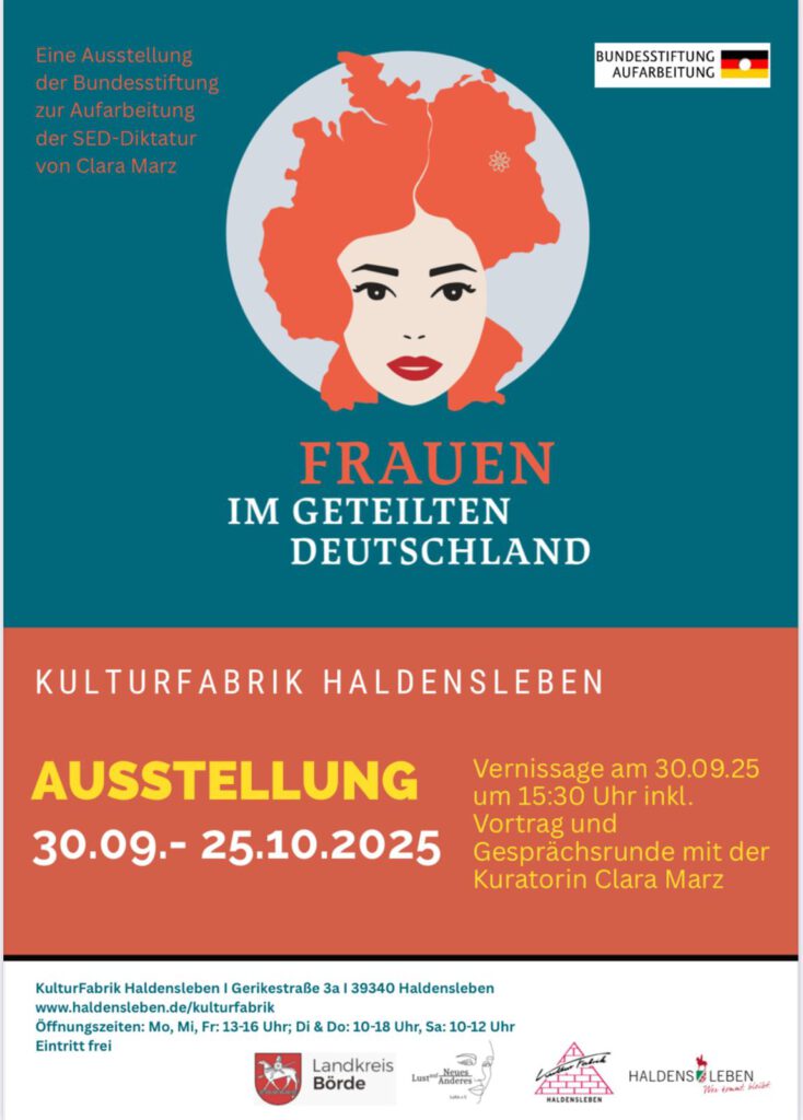 Anlässlich des 35. Tages der Deutschen Einheit veranstalten LaNA e.V., die Kulturfabrik Haldensleben und die Gleichstellungsbeauftragte des Landkreises Börde am 30. September um 15:30 Uhr eine Vernissage zur Ausstellung „Frauen im geteilten Deutschland“ samt Vortrag und Gesprächsrunde mit der Kuratorin Clara Marz.